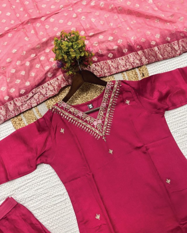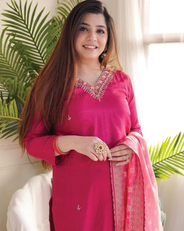 The KF-4061 kurta set captures the essence of women clothing in Qatar, bringing together premium Vichitra silk and detailed embroidery to create a piece that’s both festive and practical. The jacquard dupatta adds depth and elegance, making this outfit suitable for cultural events, parties, or traditional celebrations.