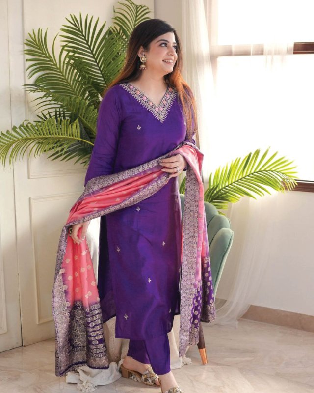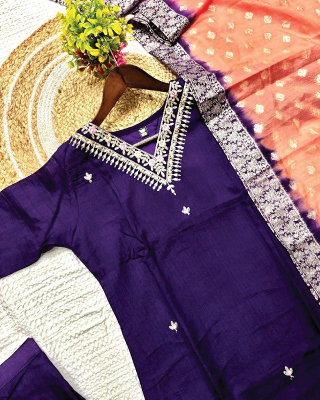 Buy Indian shalwar in Qatar with KF-4061 Vichitra Silk kurta set. Embroidery, jacquard dupatta & stitched pants—perfect festive ethnic wear for weddings & parties.