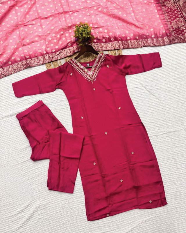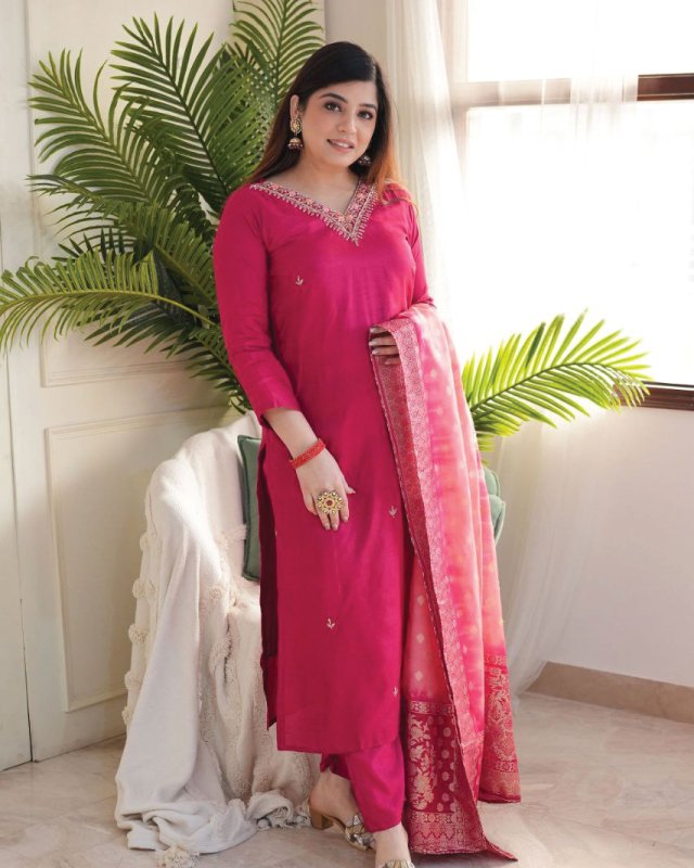 If you’re planning to buy Indian shalwar in Qatar, the KF-4061 Vichitra Silk Kurta Set is the perfect choice for women who value sophistication, tradition, and comfort. Crafted with premium Vichitra silk fabric and paired with a richly embroidered jacquard dupatta, this kurta set blends ethnic charm with modern style. Whether you’re dressing for a festive event, a wedding function, or simply upgrading your ethnic collection, the KF-4061 ensures you stand out with grace.