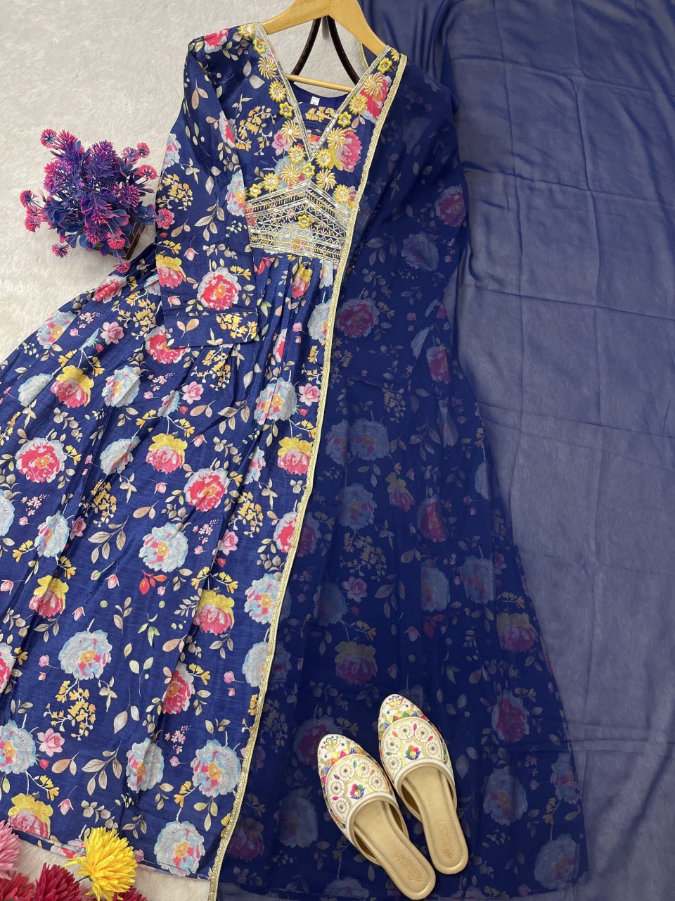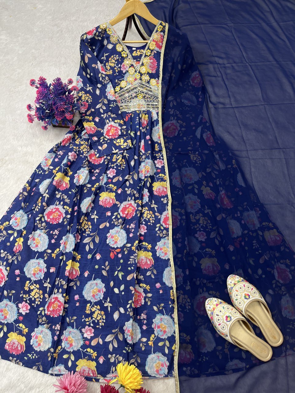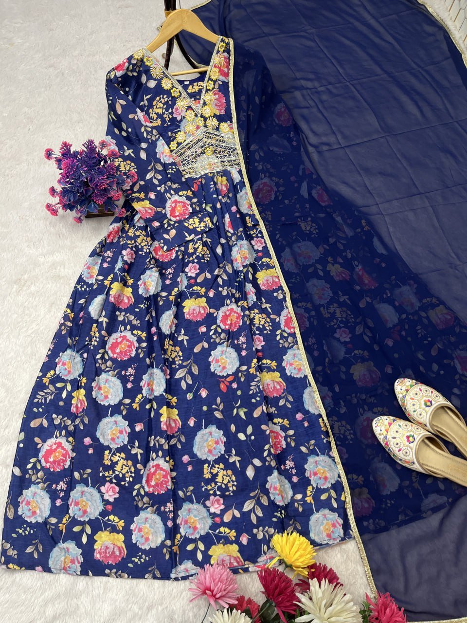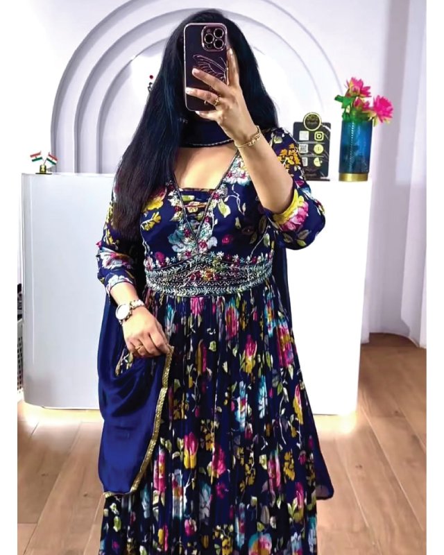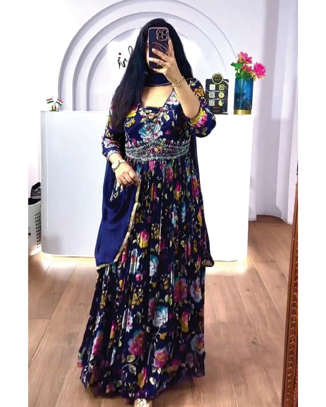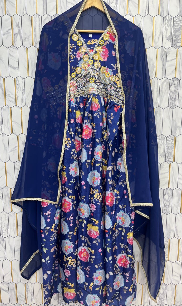 Crafted with pure chinon silk and highlighted with embroidery sequence work combined with vibrant digital prints, the gown offers both luxury and comfort. Paired with a fox georgette dupatta adorned with a four-side lace border, this outfit is designed to make you stand out at any event. Available exclusively at the best women clothing shop in Qatar, it is fully stitched, ready to wear, and comes in multiple sizes.